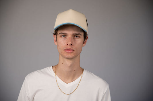 5-Panel Snapback (Curved Bill) — Natural / Sky Blue Bill — Dozen Pack