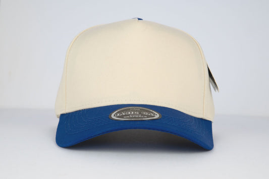 5-Panel Snapback (Curved Bill) — Natural / Blue Bill — Dozen Pack