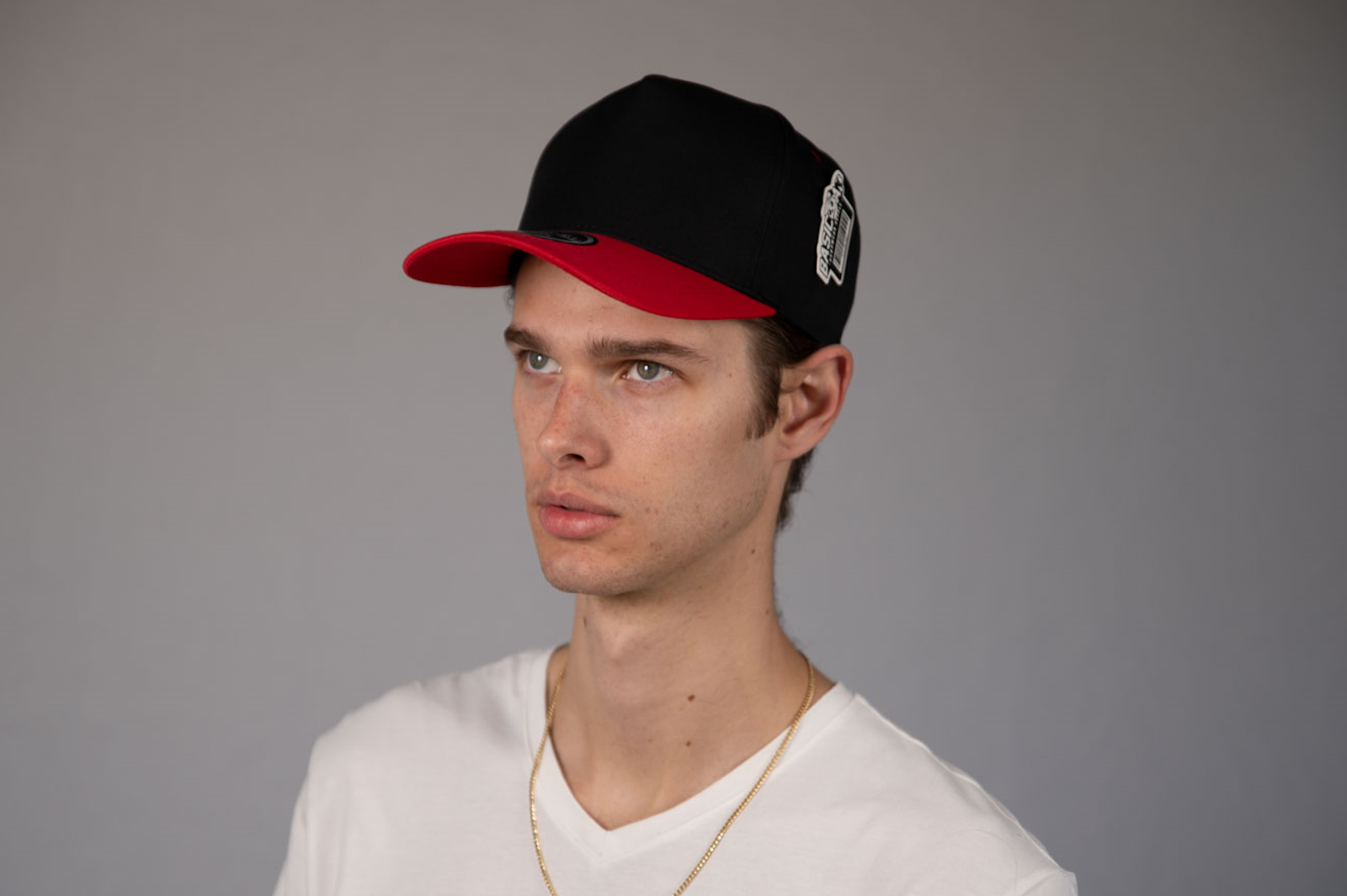5-Panel Snapback (Curved Bill) — Black / Red Bill — Dozen Pack