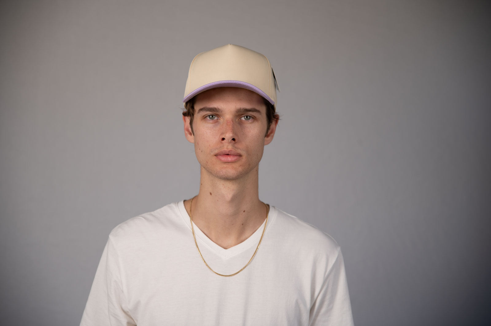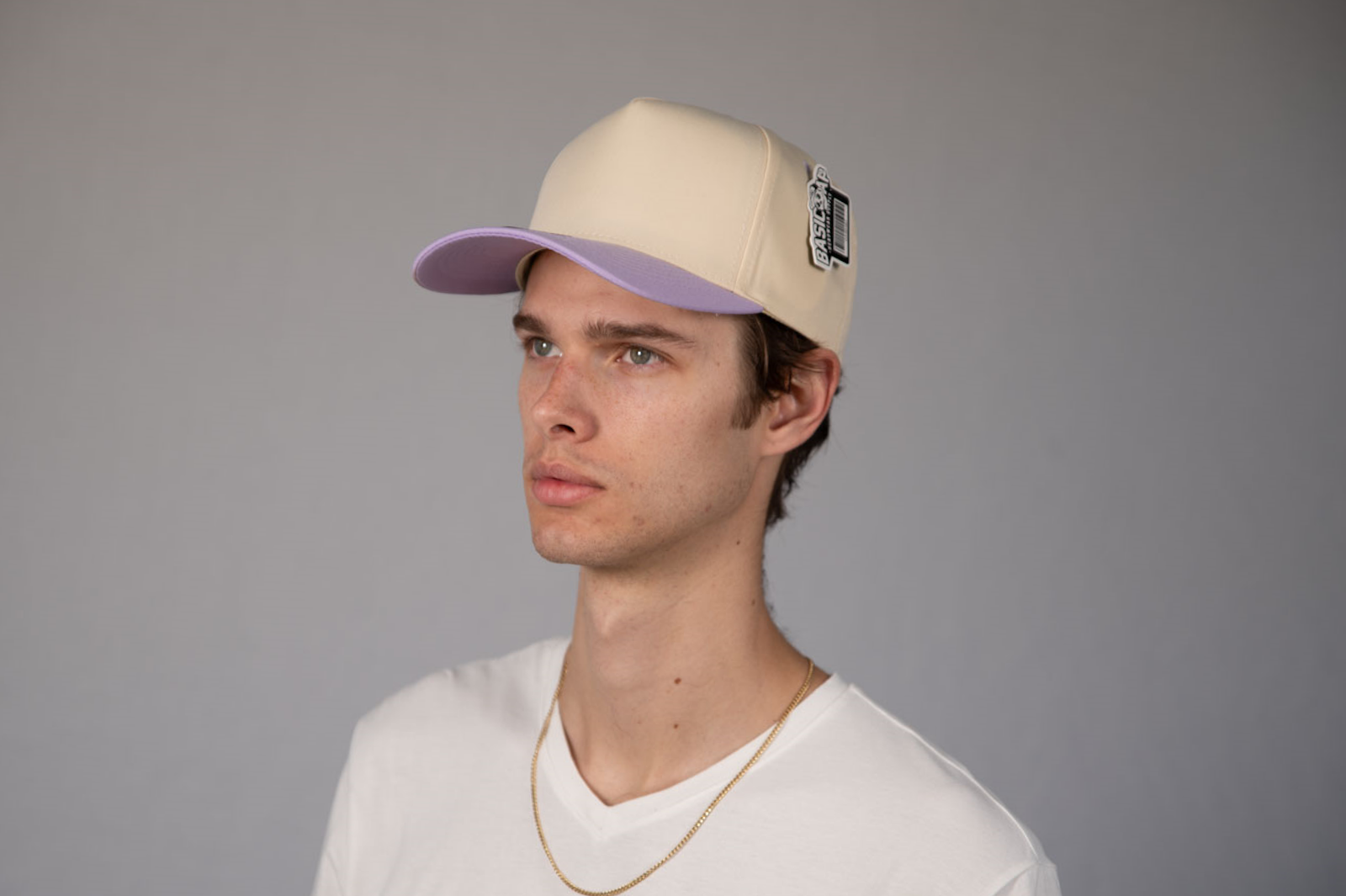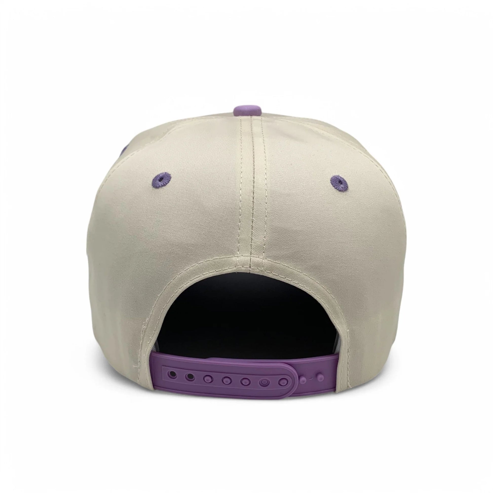 5-Panel Snapback (Curved Bill) — Natural / Light Purple Bill — Dozen Pack