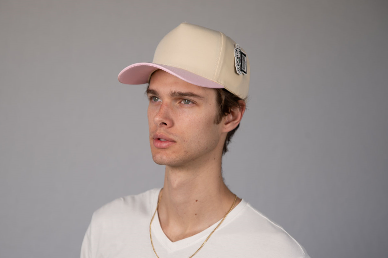 5-Panel Snapback (Curved Bill) — Natural / Pink Bill — Dozen Pack