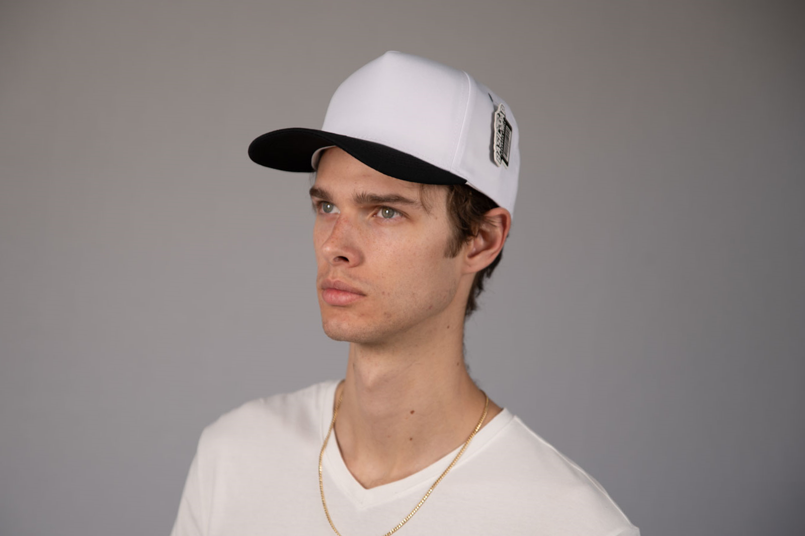 5-Panel Snapback (Curved Bill) — White / Black Bill — Dozen Pack