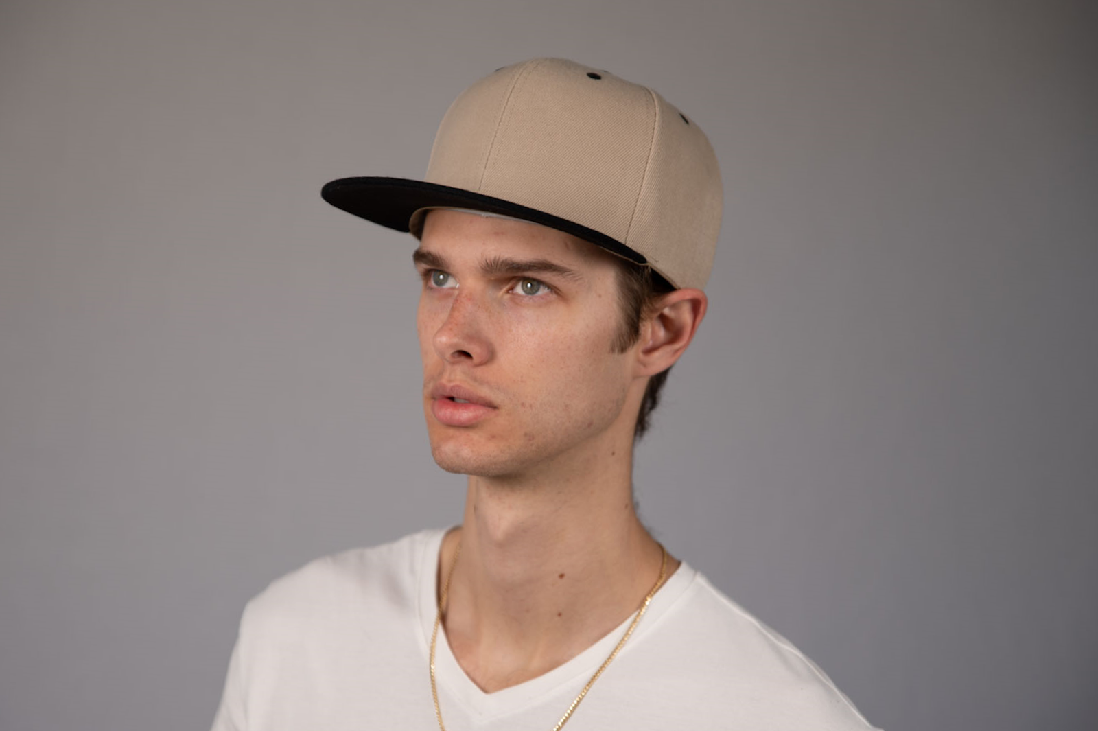 6-Panel Snapback (Flat Bill) — Khaki / Black Bill — Dozen Pack